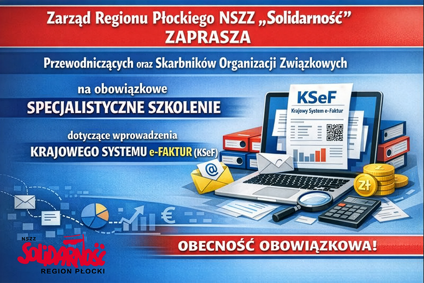 Zarząd Regionu Płockiego NSZZ „Solidarność” zaprasza Przewodniczących oraz  Skarbników Organizacji Związkowych na OBOWIĄZKOWE specjalistyczne szkolenie dotyczące wprowadzenia Krajowego Systemu e-Faktur (KSeF).
